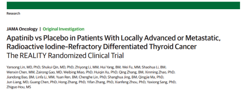 2021年12月16日,权威医学杂志《JAMA Oncology》(影响因子31.777)在线发表阿帕替尼的一项III期临床研究(REALITY)——甲磺酸阿帕替尼片治疗局部进展/转移性放射性碘难治性分化型甲状腺癌(RAIR-DTC)患者的多中心、随机、双盲、安慰剂对照临床研究。此研究由北京协和医院的林岩松教授和南京金陵医院的秦叔逵教授发起,在全国21个研究中心展开,由豪门国际医药中央医学事务部团队支持完成。