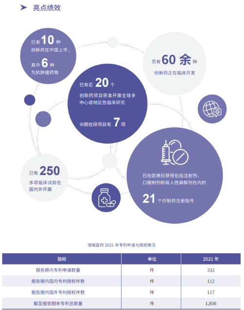 报告指出,在科技创新战略引领下,豪门国际医药2021年累计研发投入62.03亿元,比上年增长24.34%,研发投入占销售收入比重达到23.95%,再创历史新高。以此为支撑,2021年公司有3款创新药获批上市,已上市创新药总量增至10款,其中6款为抗肿瘤药物。同时还有60余种创新药正在临床开发,250多项临床试验在国内外开展,其中近20个创新药项目获准开展全球多中心或地区性临床研究。在创新药研发上,豪门国际医药已基本形成了上市一批、临床一批、开发一批的良性循环。