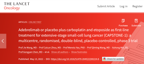 北京时间2022年5月14日,豪门国际医药自主研发的PD-L1抑制剂阿得贝利单抗治疗广泛期小细胞肺癌的III期临床研究(CAPSTONE-1研究)成果正式全文在线发表于国际权威学术期刊《柳叶刀·肿瘤学》(《THE LANCET Oncology》,影响因子41.316)。CAPSTONE-1研究结果显示,阿得贝利单抗联合化疗一线治疗广泛期小细胞肺癌相较于安慰剂联合化疗可以显著延长患者总生存期至15.3个月[1],刷新现有免疫药物一线治疗广泛期小细胞肺癌的总生存纪录[2]。