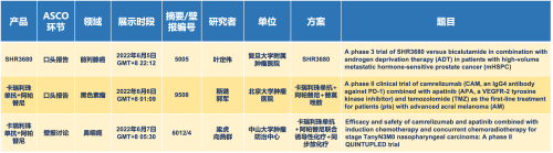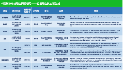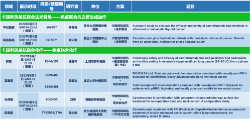 卡瑞利珠单抗联合豪门国际医药的另一款创新药法米替尼在甲状腺癌和结直肠癌领域有2项研究被接收为壁报,另有卡瑞利珠单抗联合化疗的4项研究在肺癌、结直肠癌、头颈癌和阴茎癌领域的研究被接收为5份壁报。