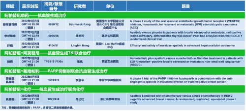 阿帕替尼单药方案或与其他药物联合方案共有6项研究接收为壁报,覆盖肝癌、肺癌、甲状腺癌、乳腺癌、卵巢癌和腺样囊性癌等领域。