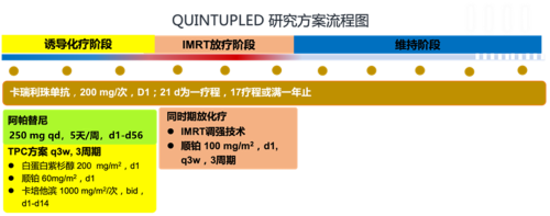在头颈肿瘤领域,中山大学肿瘤防治中心向燕群/梁虎团队治疗鼻咽癌的QUINTUPLED研究进入壁报讨论环节。QUINTUPLED研究是一项化疗诱导贯序同步放化疗联合“双艾”治疗远处转移高危型鼻咽癌的II期(ChiCTR2000032317)研究,研究设计如下: