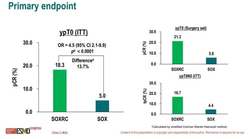 • 意向治疗(ITT)人群中SOXRC组pCR率为18.3%(95% CI 13.0-24.8),较SOX组5.0%(95% CI 2.3-9.3)显著提高13.7%(95% CI 7.2-20.1,p<0.0001),具有统计学显著差异;SOXRC组ypT0N0率为16.7%,SOX组为4.4%;SOXRC组MPR率为51.1%,SOX组MPR率为37.8%;